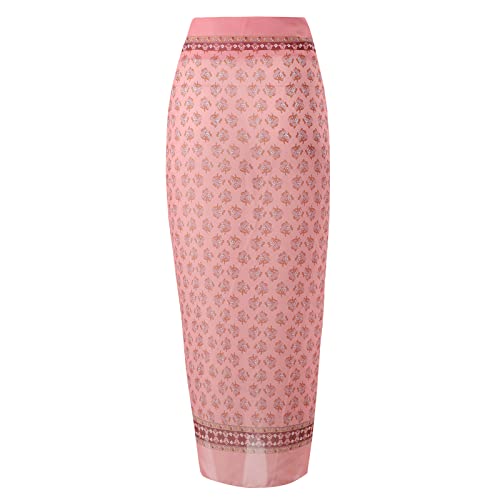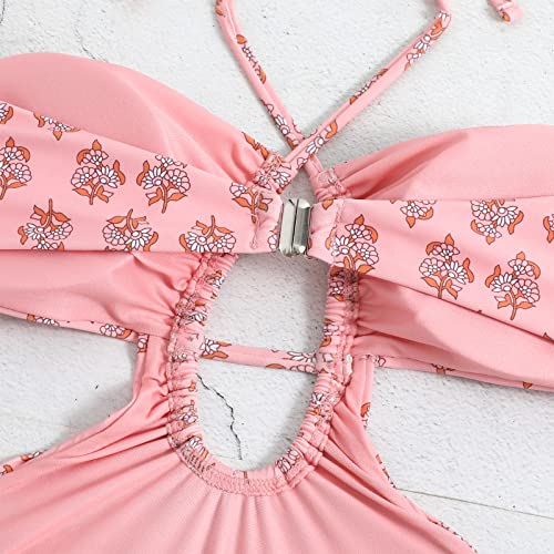 Two Pieces Swimsuits for Women Sheer Cover Ups Cheeky Push Up Bathing Suits with Wrap Skirt Halter Flattering High Cut Bikini Set Floral Sexy Plunge Summer Brazilian Swimwear Pink Halter M